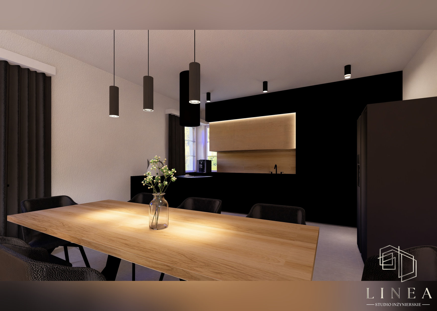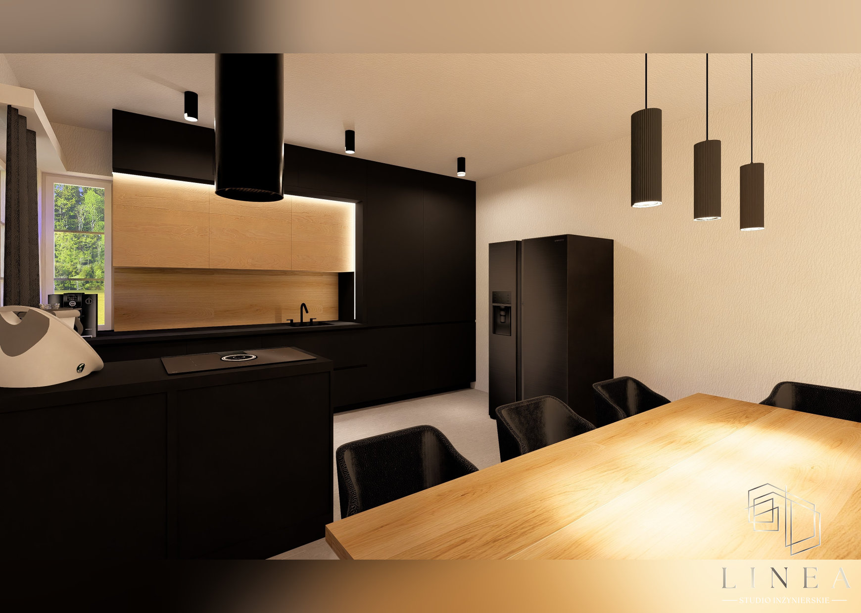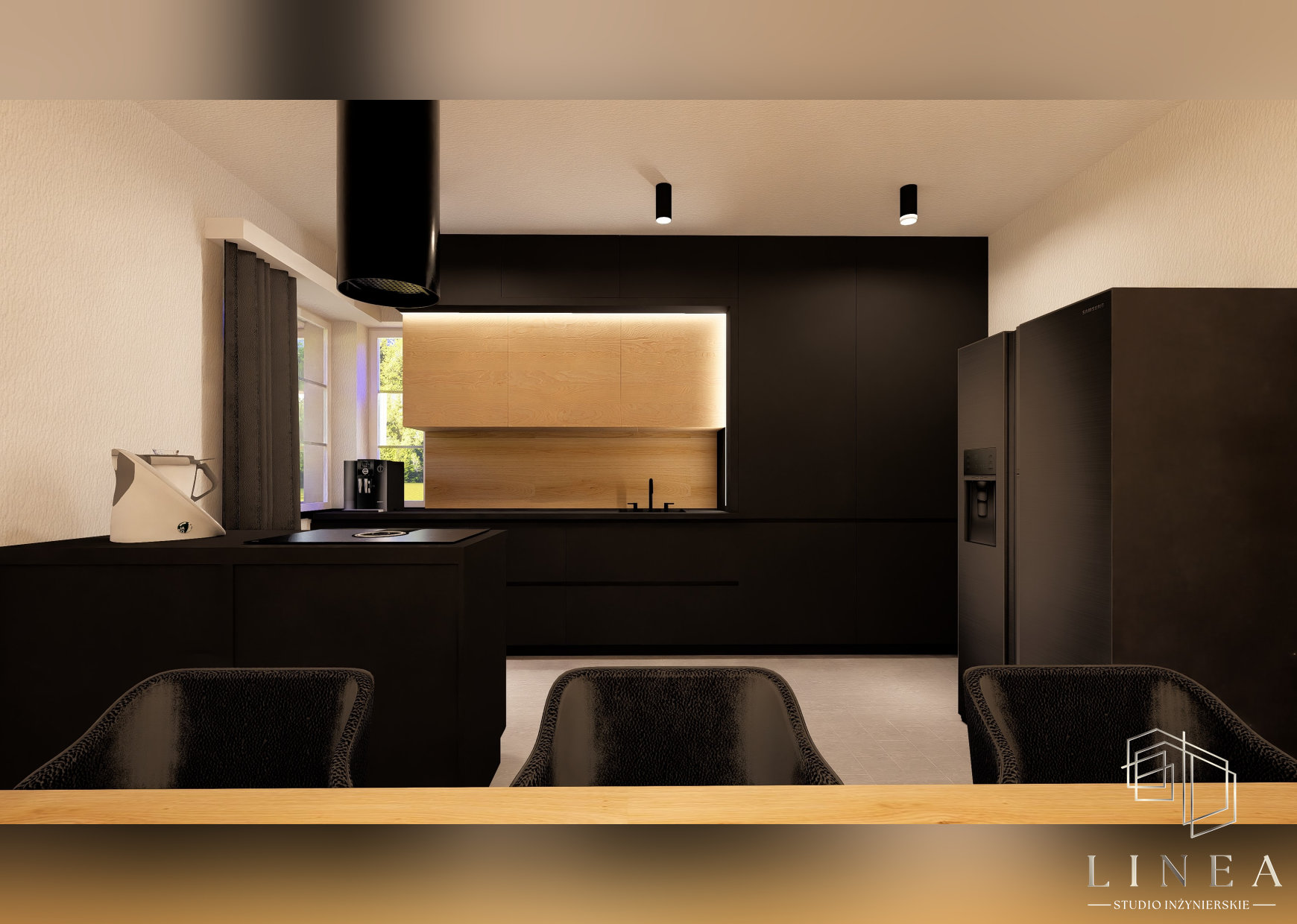 Budynek mieszkalny jednorodzinny „Zimowy Azyl” w Okoninach Nadjeziornych Wizualizacja kuchni Wizualizacja kuchni, w której panuje minimalistyczny design, gdzie detale w postaci drewnianych akcentów łagodzą surowość czerni.