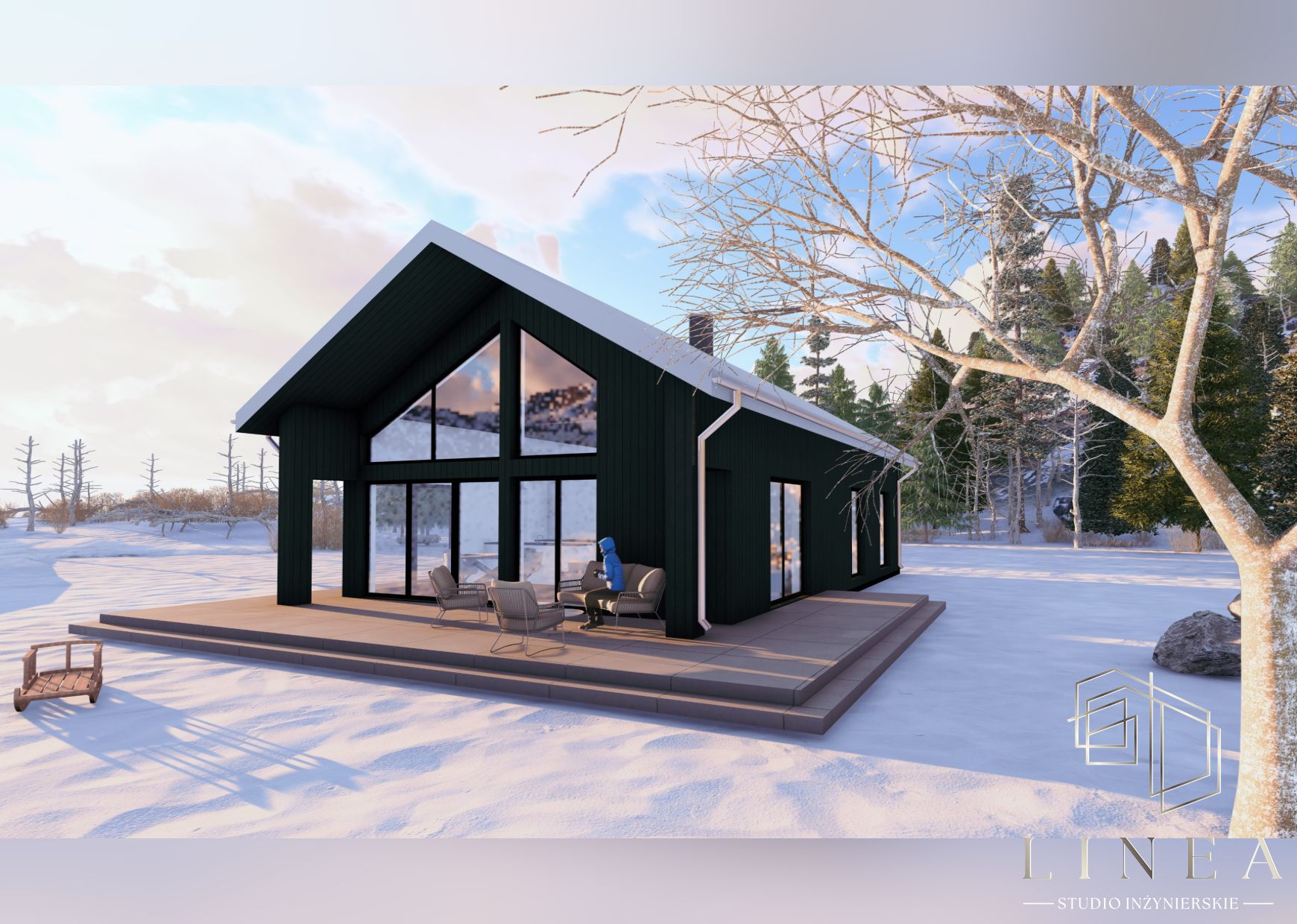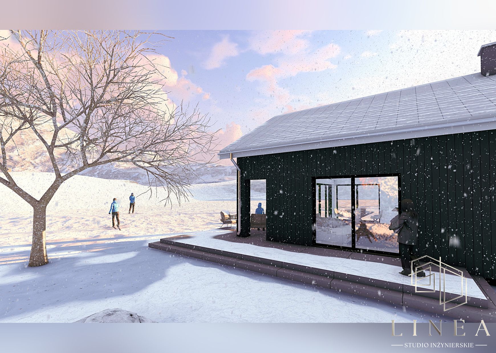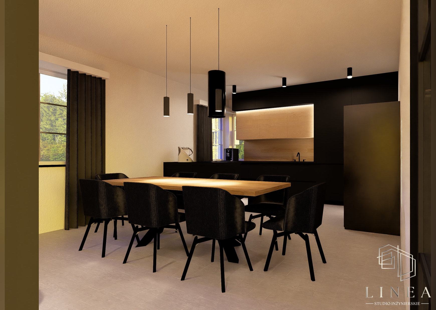 Budynek mieszkalny jednorodzinny „Zimowy Azyl” w Okoninach Nadjeziornych Wizualizacja kuchni Wizualizacja kuchni, w której panuje minimalistyczny design, gdzie detale w postaci drewnianych akcentów łagodzą surowość czerni.